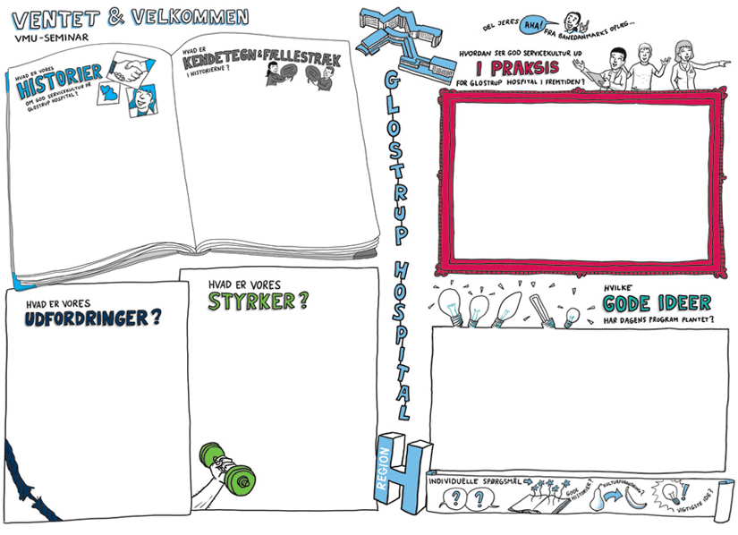 Visuel skabelon vi producerede til et større ledelses-seminar, som deltagerne selv kunne udfylde i grupper som en del af proces-udvikling.